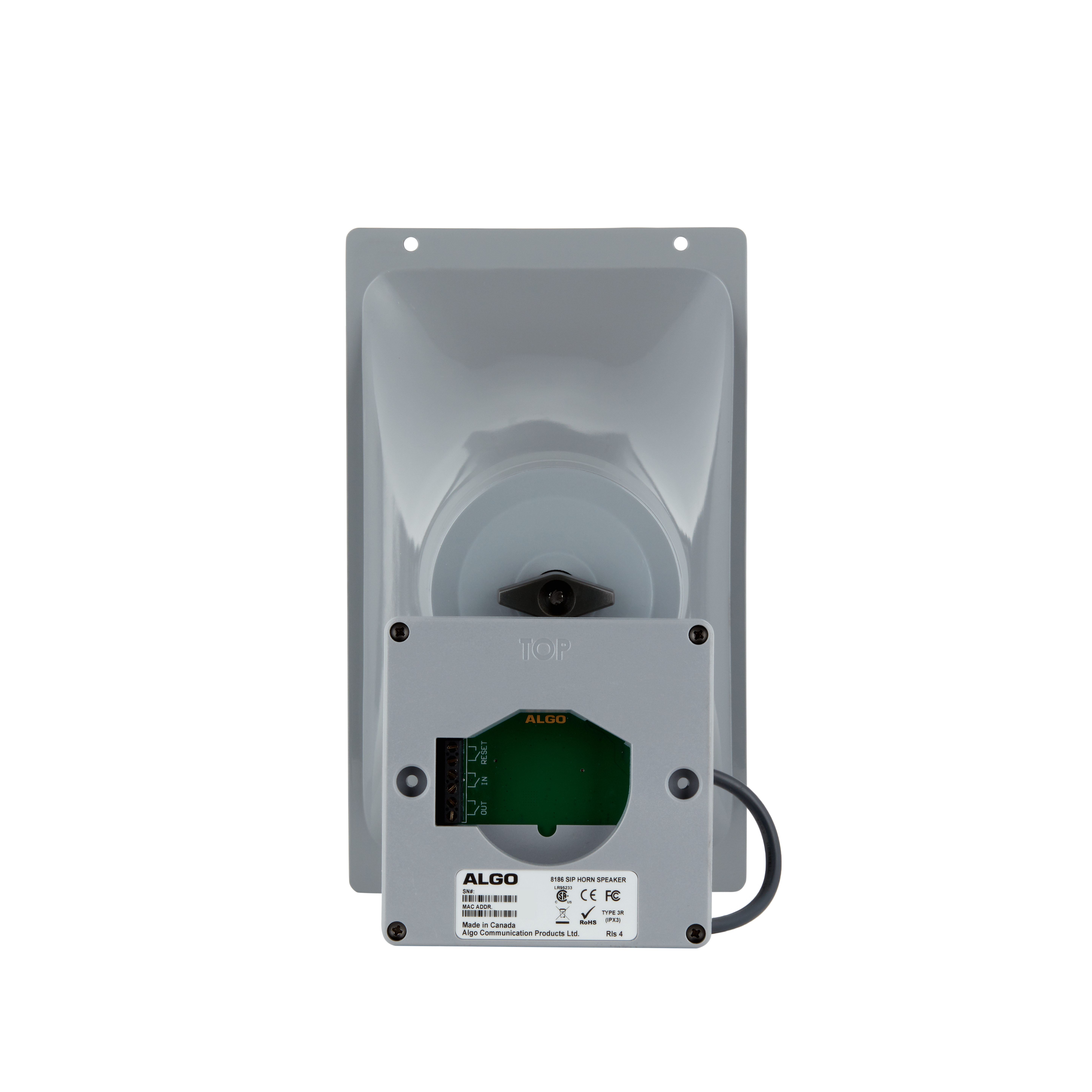 En résumé, le 8186 est un haut-parleur à pavillon SIP auto-amplifié. Aucun amplificateur séparé n'est donc nécessaire. Le terminal est alimenté via PoE (IEEE 802.3af). Une plaque de montage est fournie pour faciliter l'installation sur un mur ou un plafond. Le pavillon peut également être installé sur un boîtier double standard si un conduit est raccordé au haut-parleur. Le produit est certifié CSA/UL, FCC et CE.