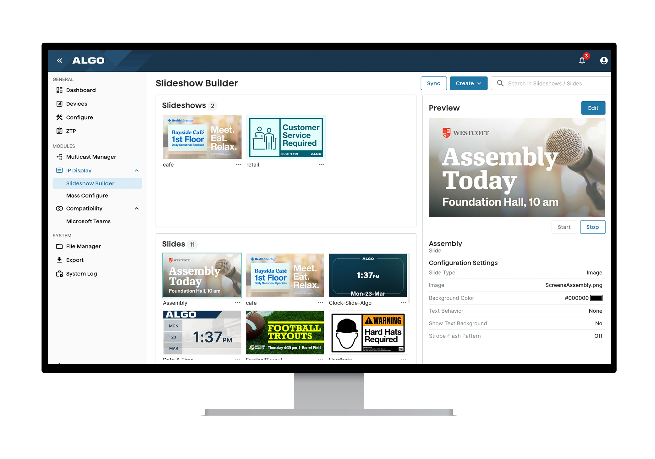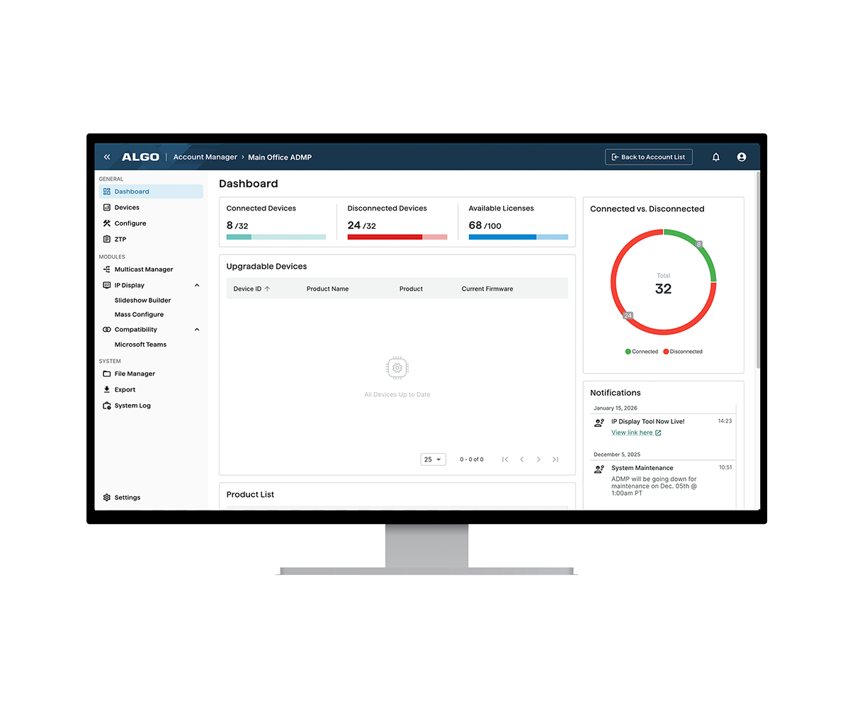 L'ADMP permet aux utilisateurs de surveiller l'état général, la connectivité et la santé de tous les appareils Algo. Si un appareil Algo se déconnecte pour une raison quelconque, un système de notification par e-mail envoie automatiquement une alerte à l'utilisateur enregistré.