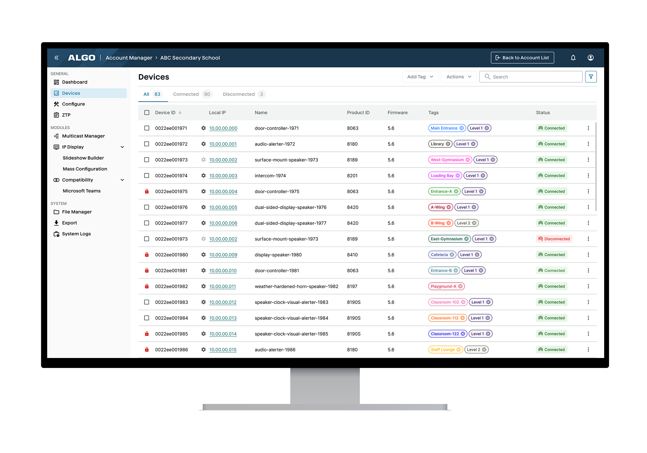 La plateforme de gestion des appareils Algo simplifie le processus de gestion, de surveillance et de maintenance des appareils Algo. Elle est particulièrement utile pour les organisations qui gèrent plusieurs appareils répartis sur un grand site ou un campus, ou pour un fournisseur de services qui gère des appareils pour plusieurs utilisateurs finaux et sur plusieurs sites. L'ADMP permet aux utilisateurs de voir facilement si un appareil est hors ligne et de réagir si nécessaire en actualisant l'appareil ou en se rendant sur place pour l'inspecter. Étant donné que l'état de chaque appareil peut être vérifié et que des actions peuvent être effectuées à distance, telles que le lancement d'une mise à niveau massive, l'ADMP est idéal pour réduire le nombre de visites que les fournisseurs de services doivent effectuer sur chaque site, ce qui réduit par la suite les frais de déplacement et de main-d'œuvre.